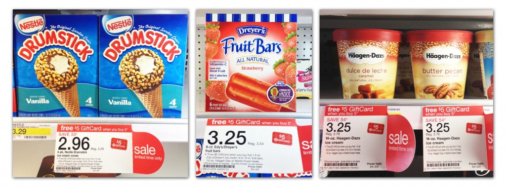 I spotted a great deal at Target on several different cold treats. Buy 5 Dreyer’s Fruit Bars, Nestlé Drumsticks or Häagen-Dazs in any combination and you’ll receive a $5 gift card. We’ve given you a scenario which includes a little of each. Let us know what you were able to score and how!