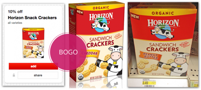 Horizon Crackers TargetThe printable BOGO coupon for Horizon sandwich crackers has reset! Stack this coupon with a Cartwheel offer AND pay with your REDcard to pick up two boxes of sandwich crackers for only $1.33 each at Target.